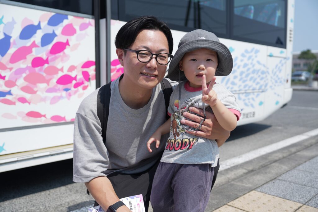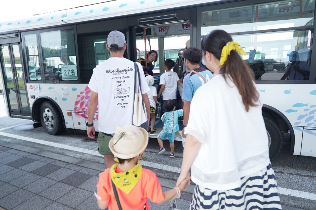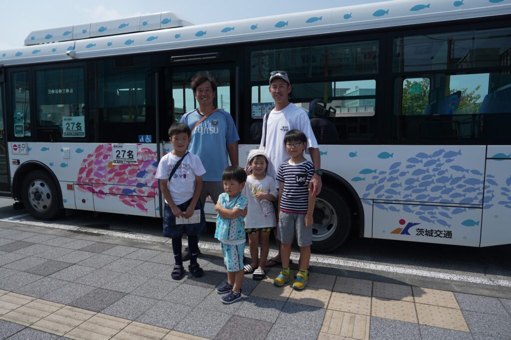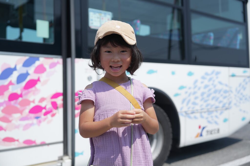 おさかなセンターに集合し、受付を済ませたご家族から『こども免許証』(※休日限定)用の写真をバスの前で撮影しました。