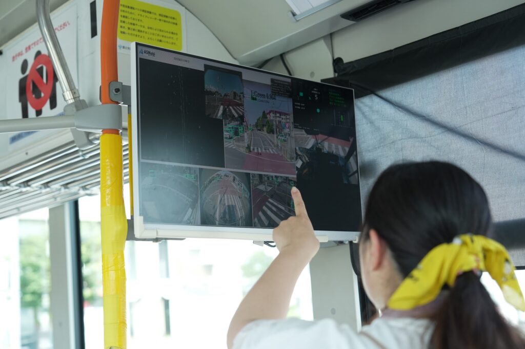 乗車開始後には自動運転の仕組みについて車内モニターを見ながらお伝えしました。