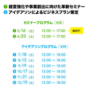 5,6月に実施する2回のセミナーを通じて新規事業開発に向けたインプットを行い、7〜12月には6回のアイデアソンを実施します!