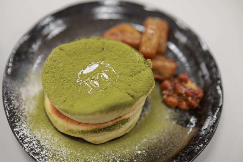 試作したのが、牛久市女化産小麦粉と粉茶、トッピングとして市内さつまいも菓子専門店の大学芋など地域食材を活かした「かっぱのキューちゃんパンケーキ」。景観とともに楽しめるよう、テイクアウト用パッケージやドリンクの試作にも取り組みました。